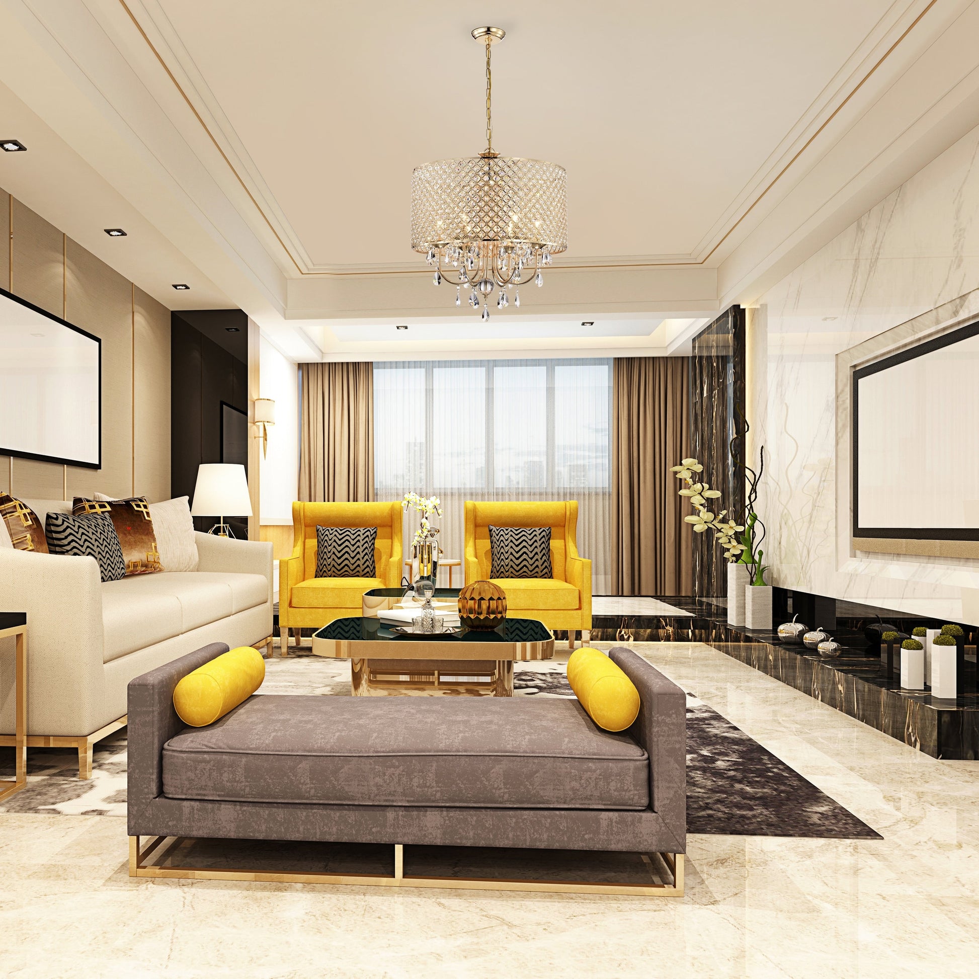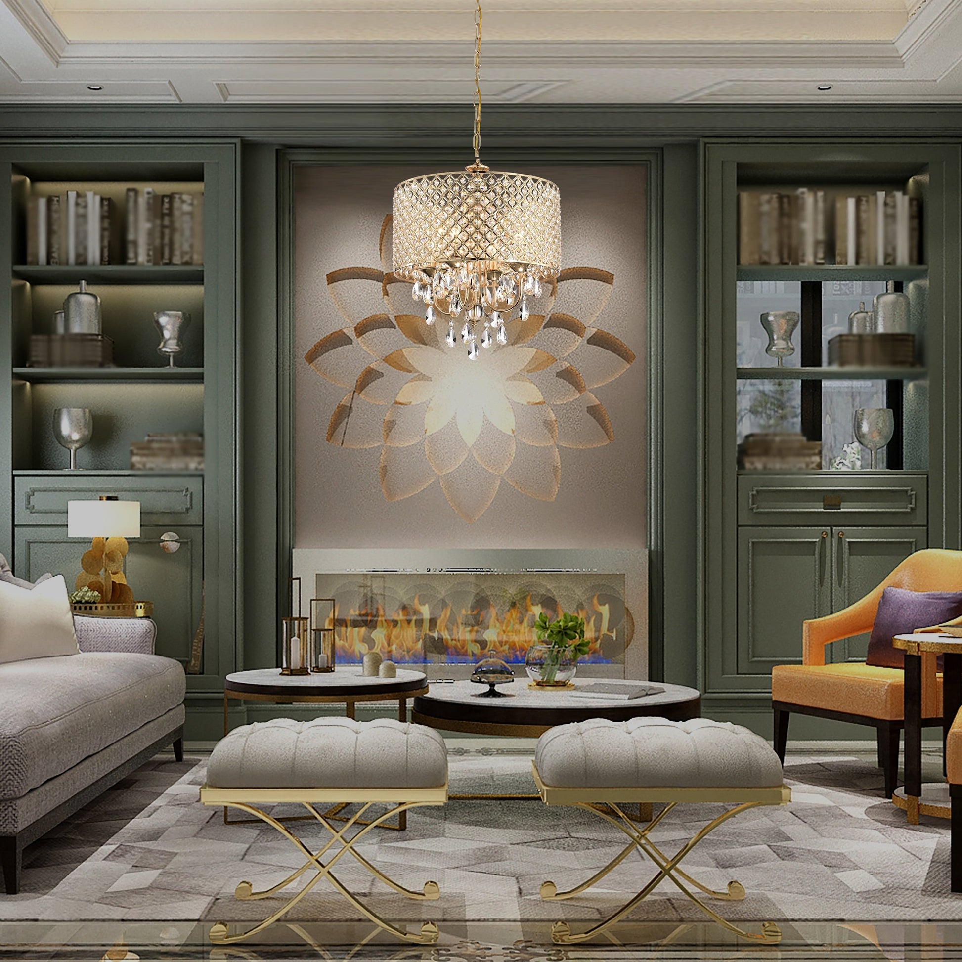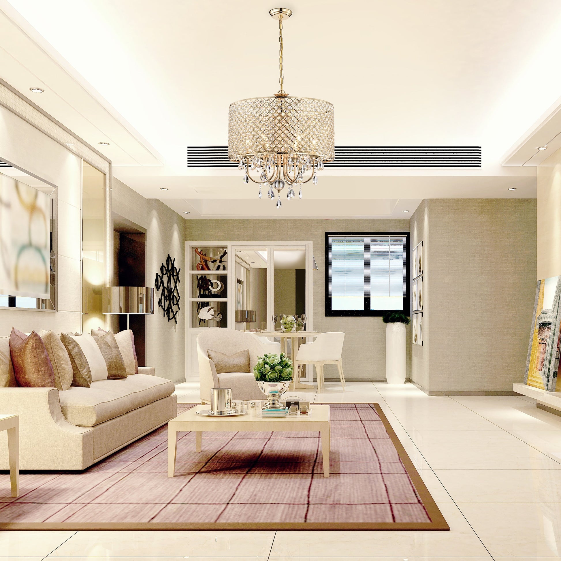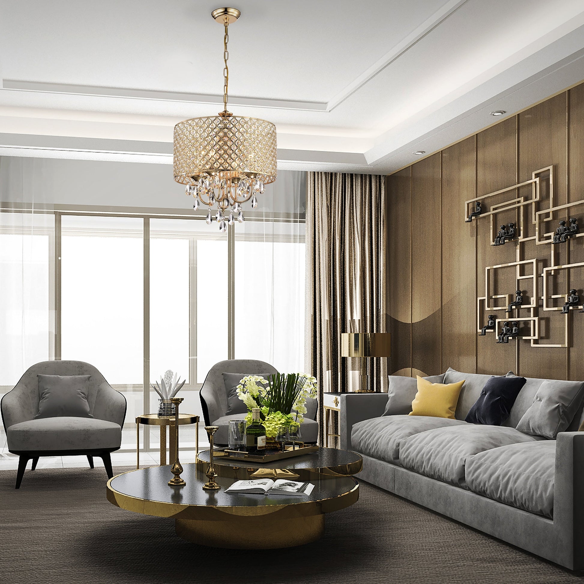 Lustre tambour rond à perles avec cristaux suspendus