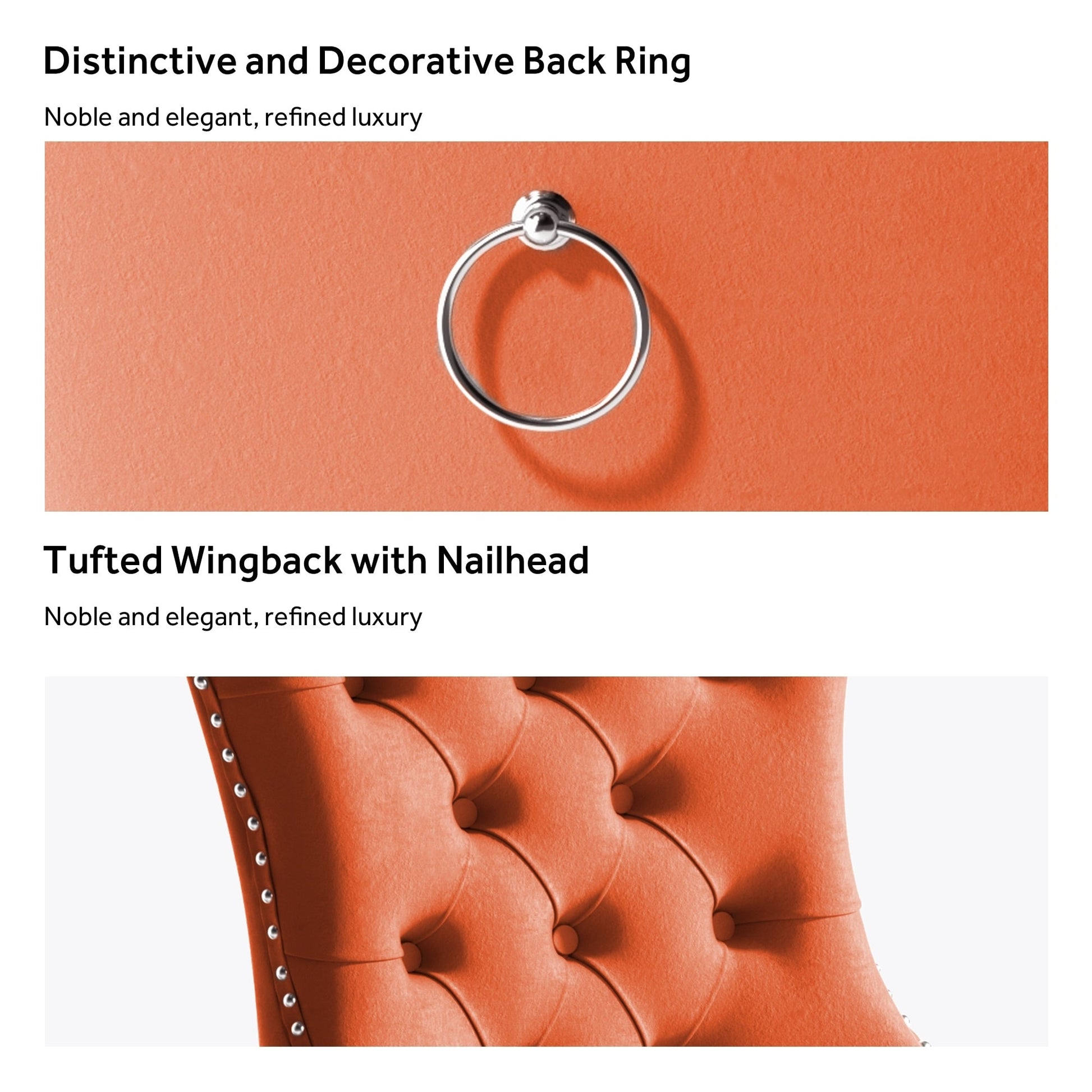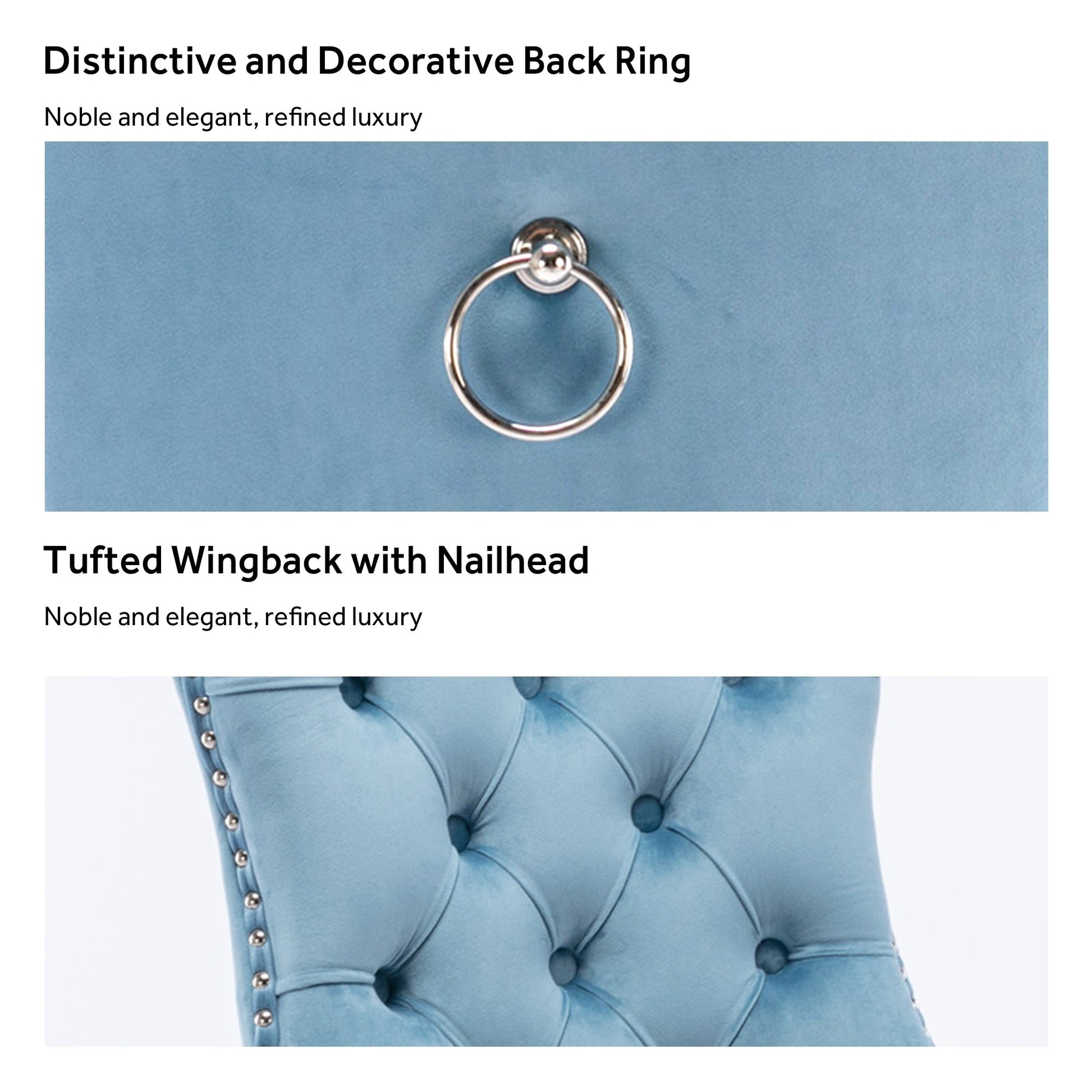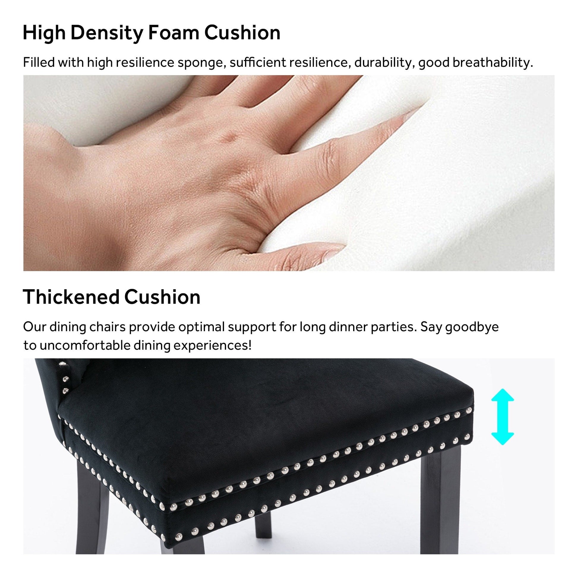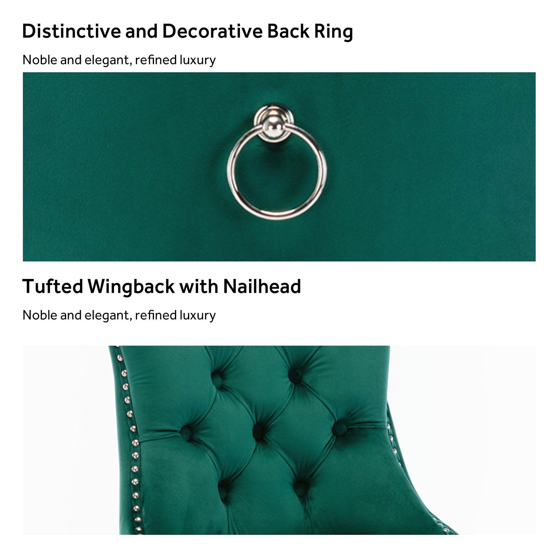 Ces chaises de salle à manger à oreilles sont confectionnées en velours de haute qualité, extrêmement résistant à l'usure et inaltérable. Le tissu, épais et luxueux, offre un toucher d'une grande finesse. Cet ensemble de chaises de salle à manger en velours arbore un style mid-century résolument moderne. Dotées d'un haut dossier, ces chaises assurent un excellent maintien du dos. Les nombreux rivets décoratifs incrustés autour du coussin et du dossier confèrent à l'ensemble une allure noble et élégante, et une impression de luxe raffiné. Nous fournissons une notice de montage et des vidéos explicatives. Pour toute question, n'hésitez pas à nous contacter.