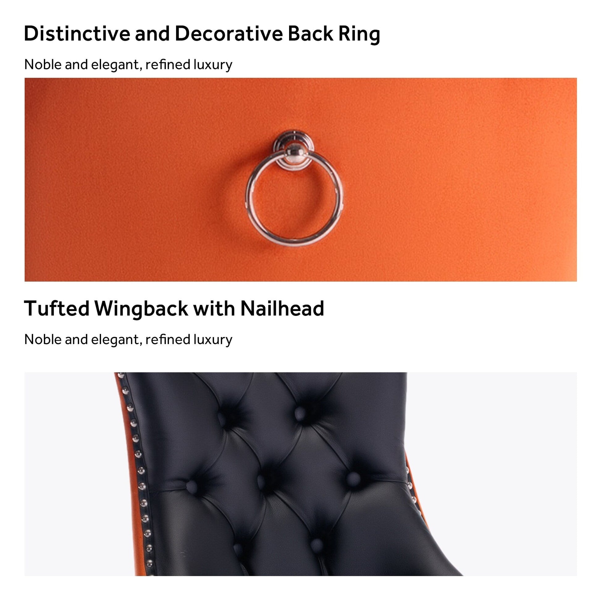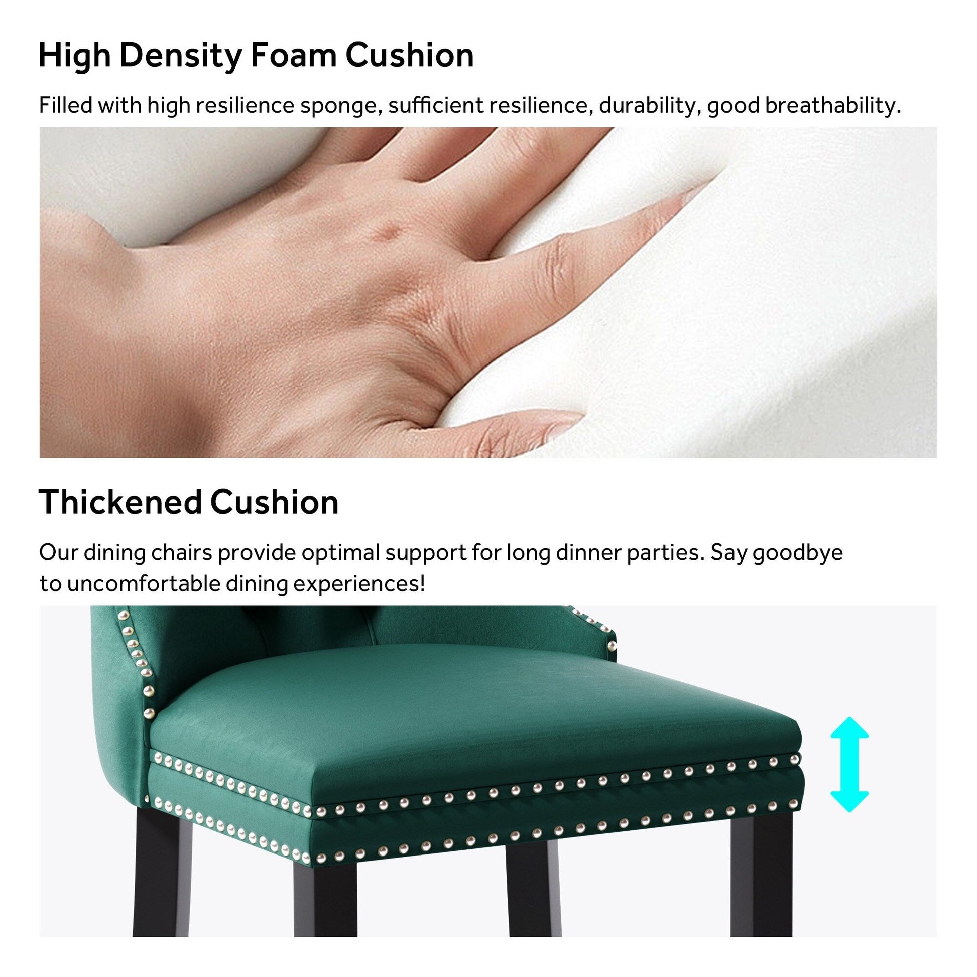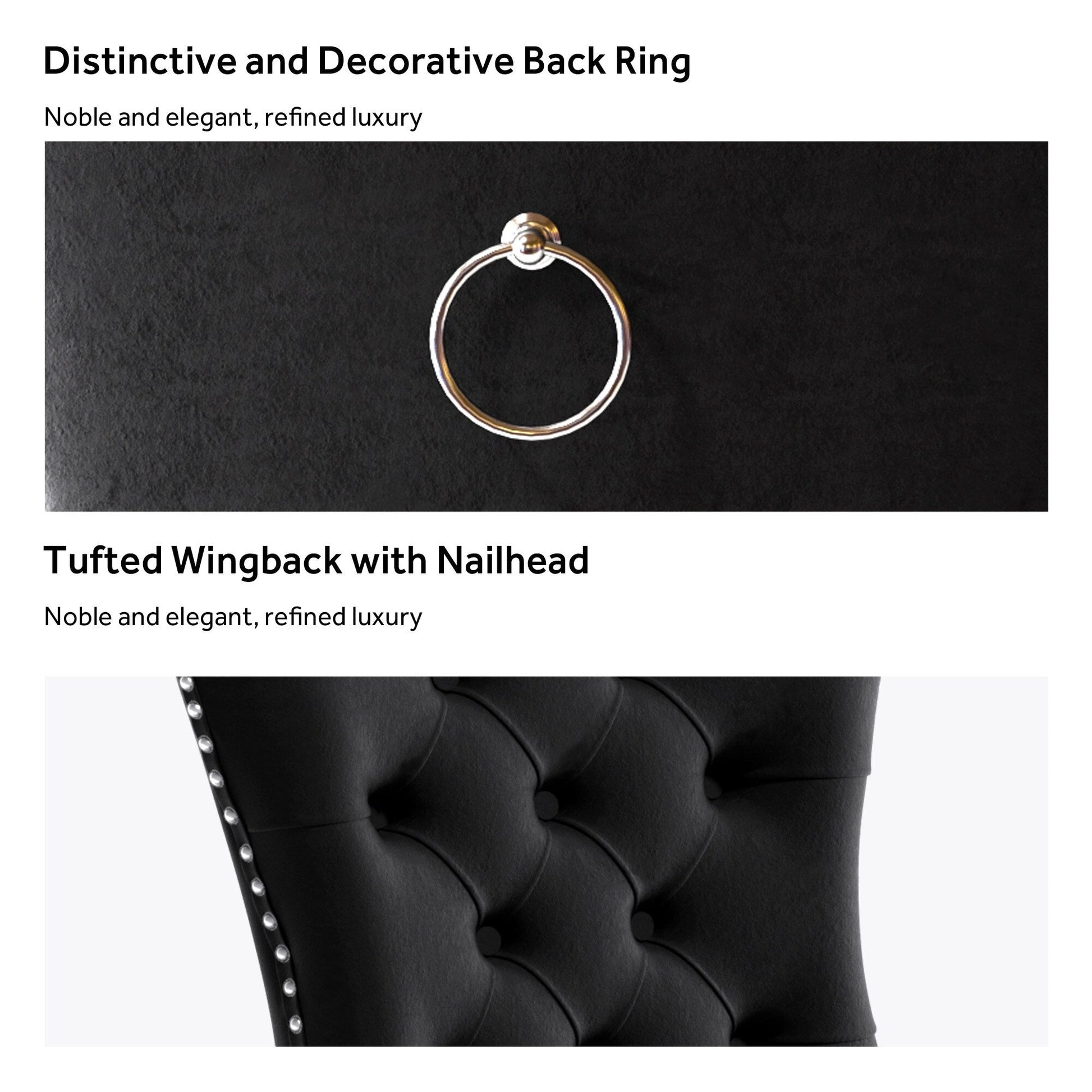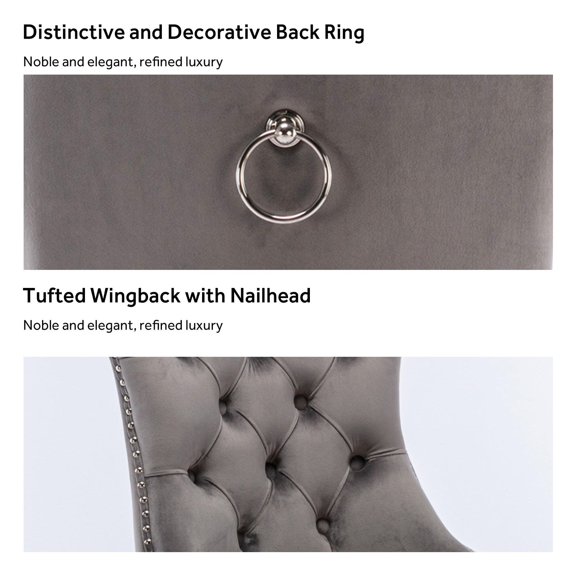 Ces chaises de salle à manger à oreilles sont confectionnées en velours de haute qualité, extrêmement résistant à l'usure et inaltérable. Le tissu, épais et luxueux, offre un toucher d'une grande finesse. Cet ensemble de chaises de salle à manger en velours arbore un style mid-century résolument moderne. Dotées d'un haut dossier, ces chaises assurent un excellent maintien du dos. Les nombreux rivets décoratifs incrustés autour du coussin et du dossier confèrent à l'ensemble une allure noble et élégante, et une impression de luxe raffiné. Nous fournissons une notice de montage et des vidéos explicatives. Pour toute question, n'hésitez pas à nous contacter.