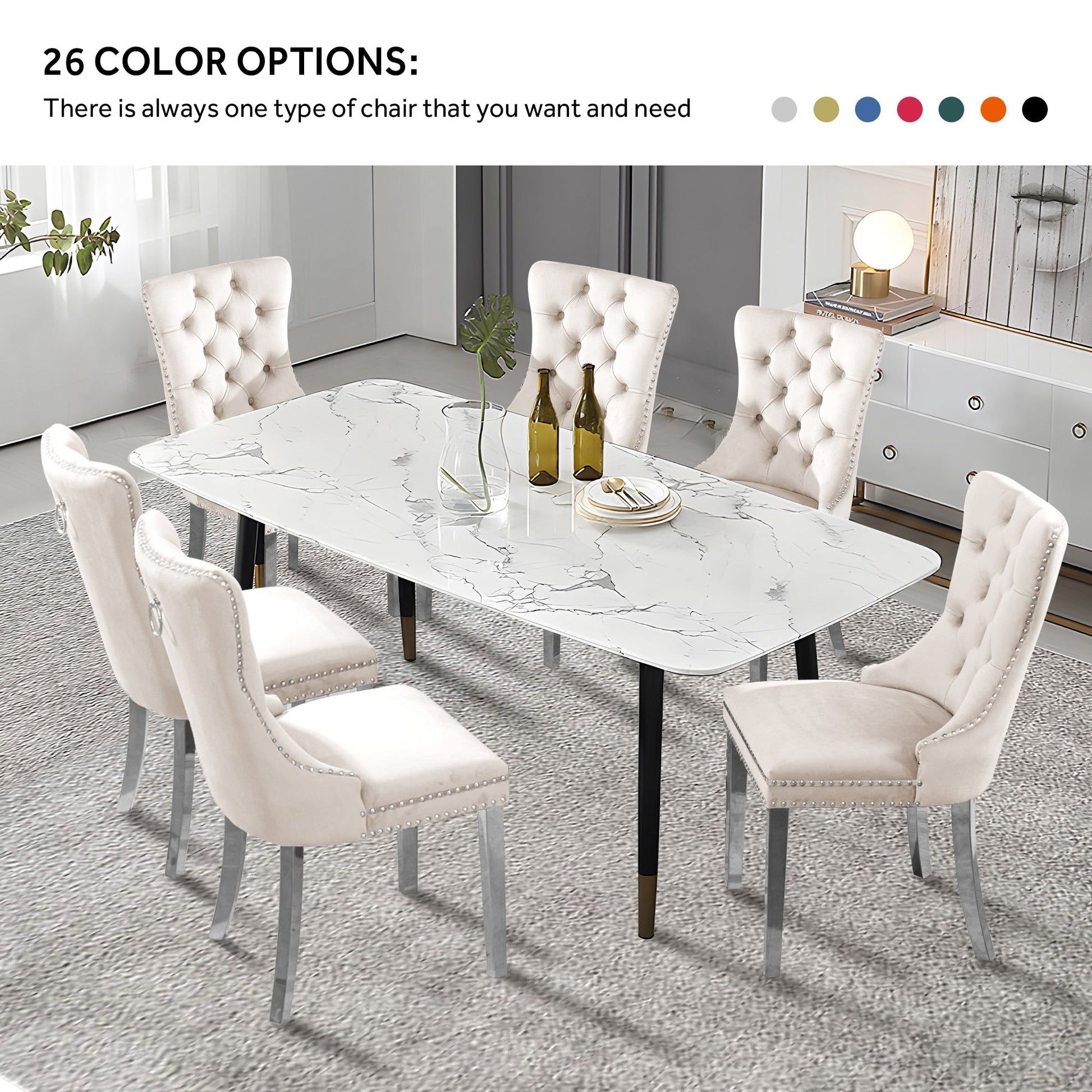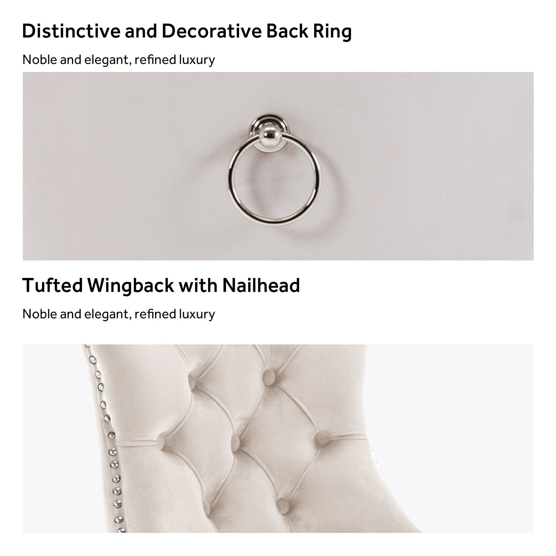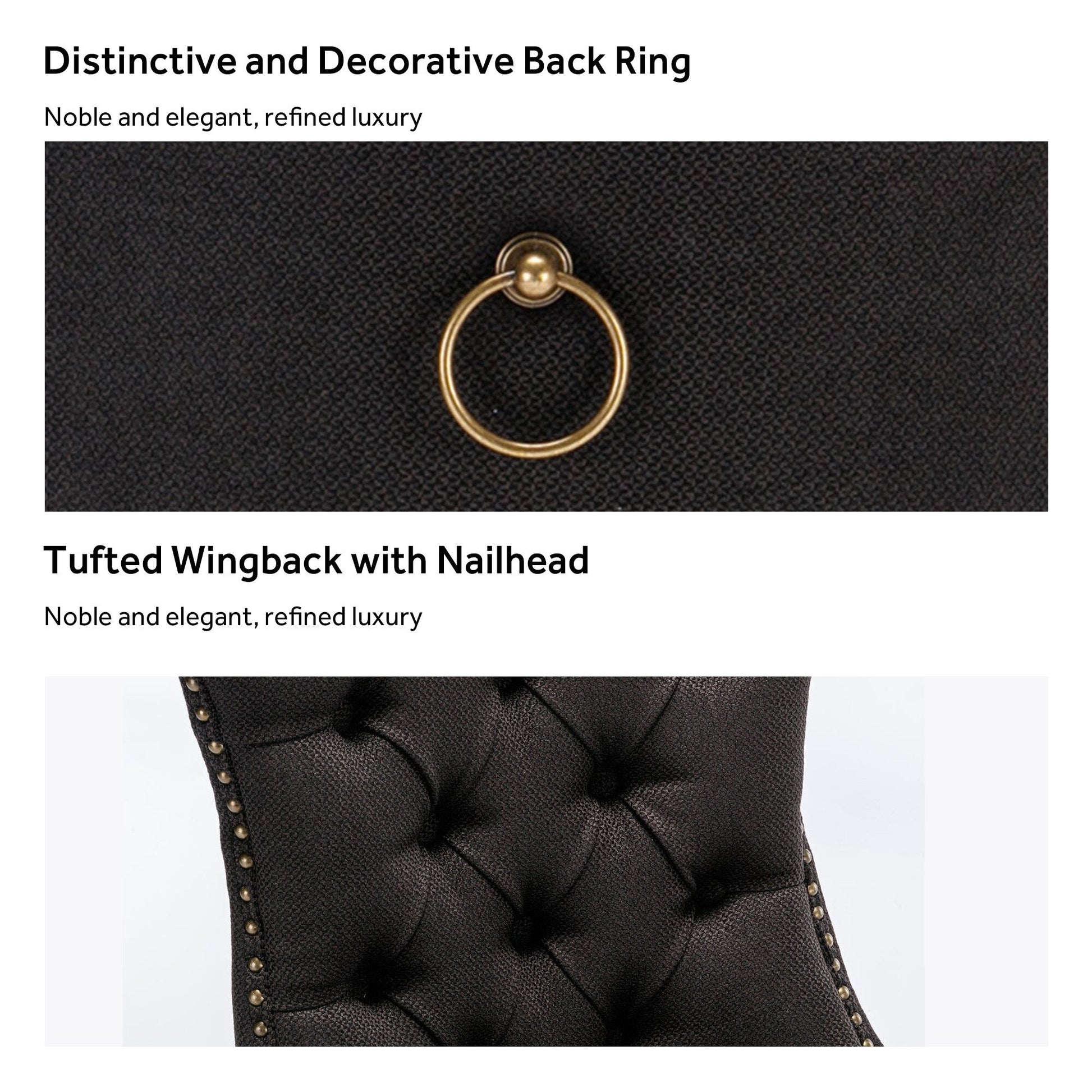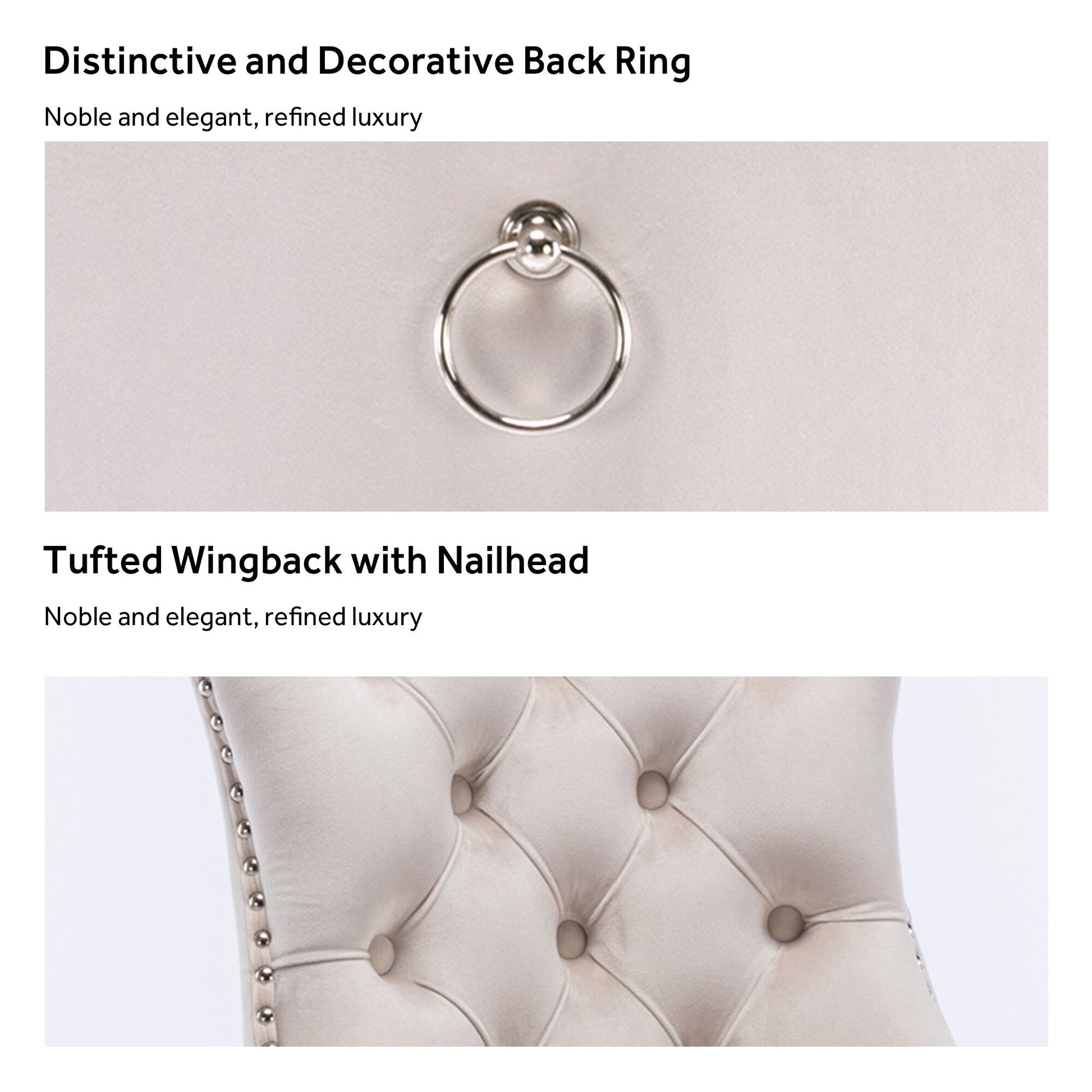 Ces chaises de salle à manger à oreilles sont confectionnées en velours de haute qualité, extrêmement résistant à l'usure et inaltérable. Le tissu, épais et luxueux, offre un toucher d'une grande finesse. Cet ensemble de chaises de salle à manger en velours arbore un style mid-century résolument moderne. Dotées d'un haut dossier, ces chaises assurent un excellent maintien du dos. Les nombreux rivets décoratifs incrustés autour du coussin et du dossier confèrent à l'ensemble une allure noble et élégante, et une impression de luxe raffiné. Nous fournissons une notice de montage et des vidéos explicatives. Pour toute question, n'hésitez pas à nous contacter.