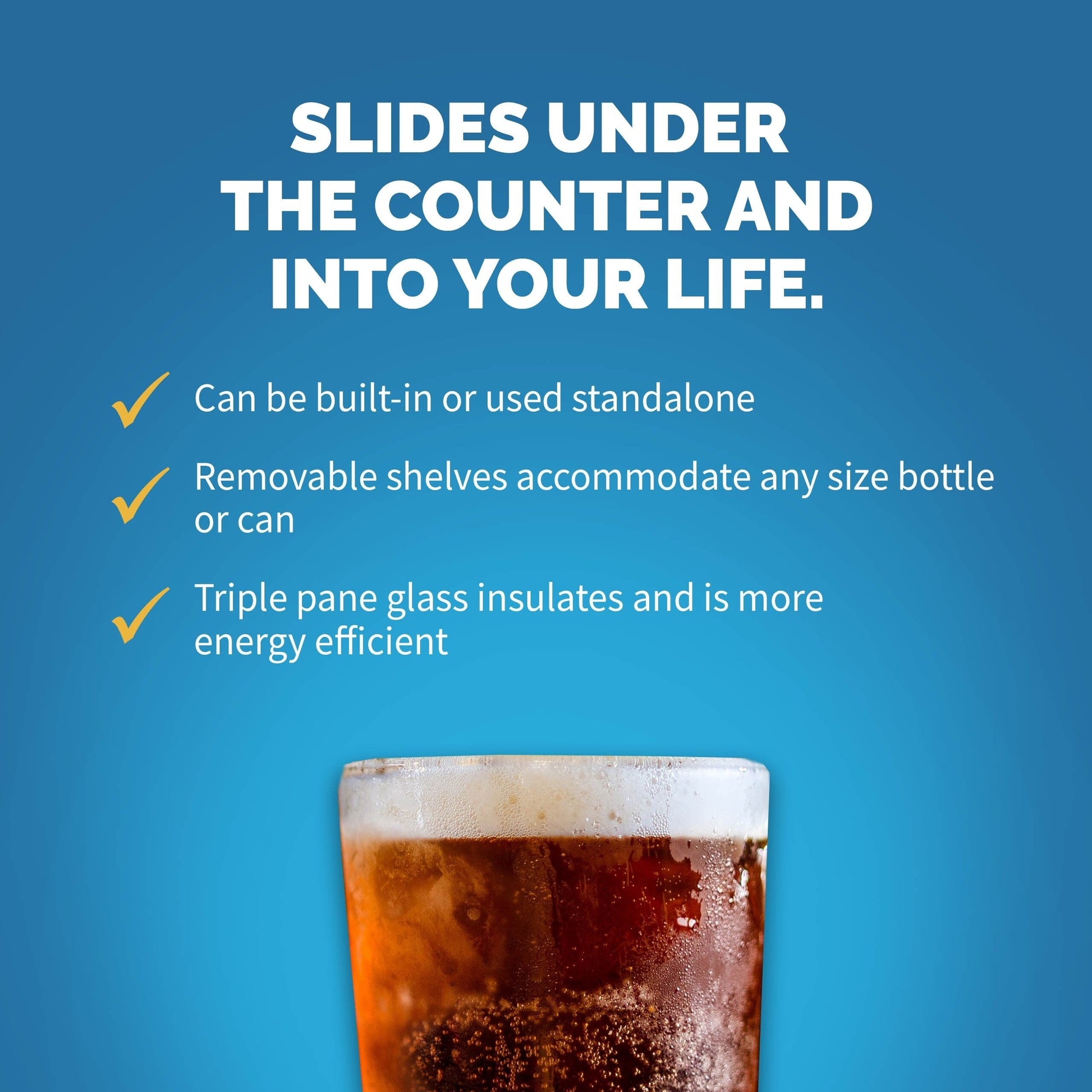Grâce à son compresseur silencieux à ventilation frontale, ce réfrigérateur à boissons spacieux s'intègre facilement sous les plans de travail standard. Glissez-le simplement en place pour un style épuré et intégré qui se fond parfaitement avec vos meubles, ou laissez-le seul. À vous de choisir.