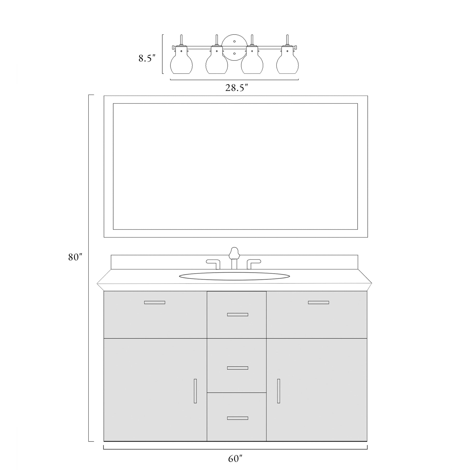 • 4 lumières : 72,4 cm (L) x 16,5 cm (P) x 21,6 cm (H)