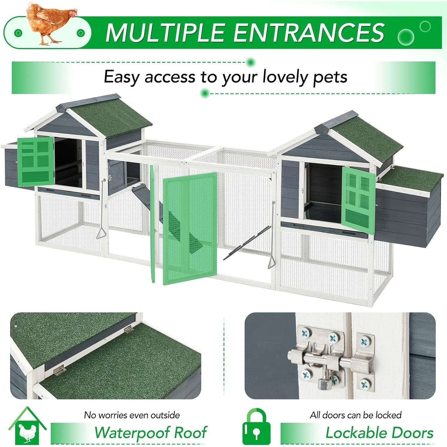 • Grand espace de vie – Ce grand poulailler est conçu en deux niveaux : un poulailler principal pour dormir à l'étage et une cage de course protégée par un grillage à l'étage inférieur. Les animaux domestiques peuvent également bénéficier d'un logement de luxe.